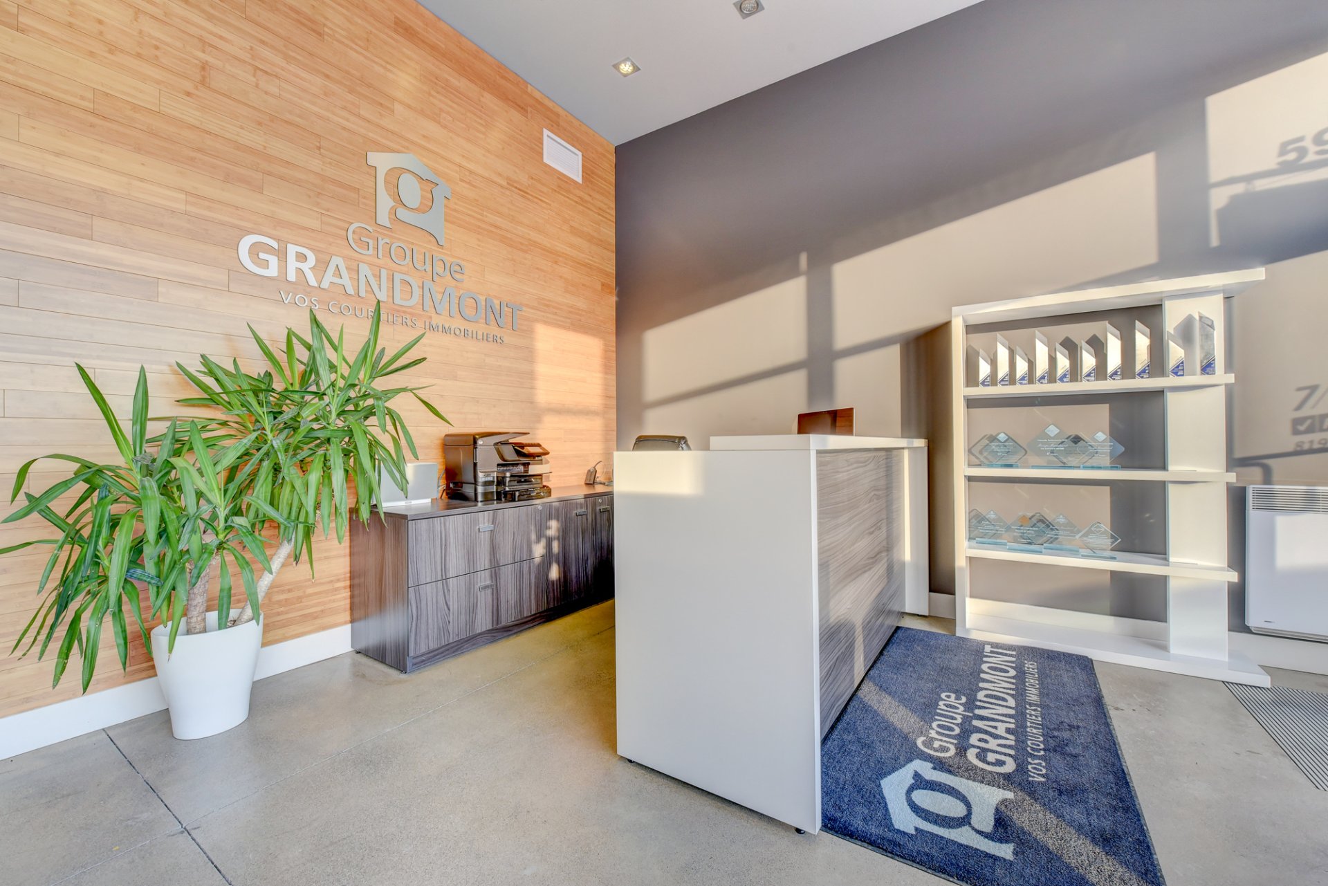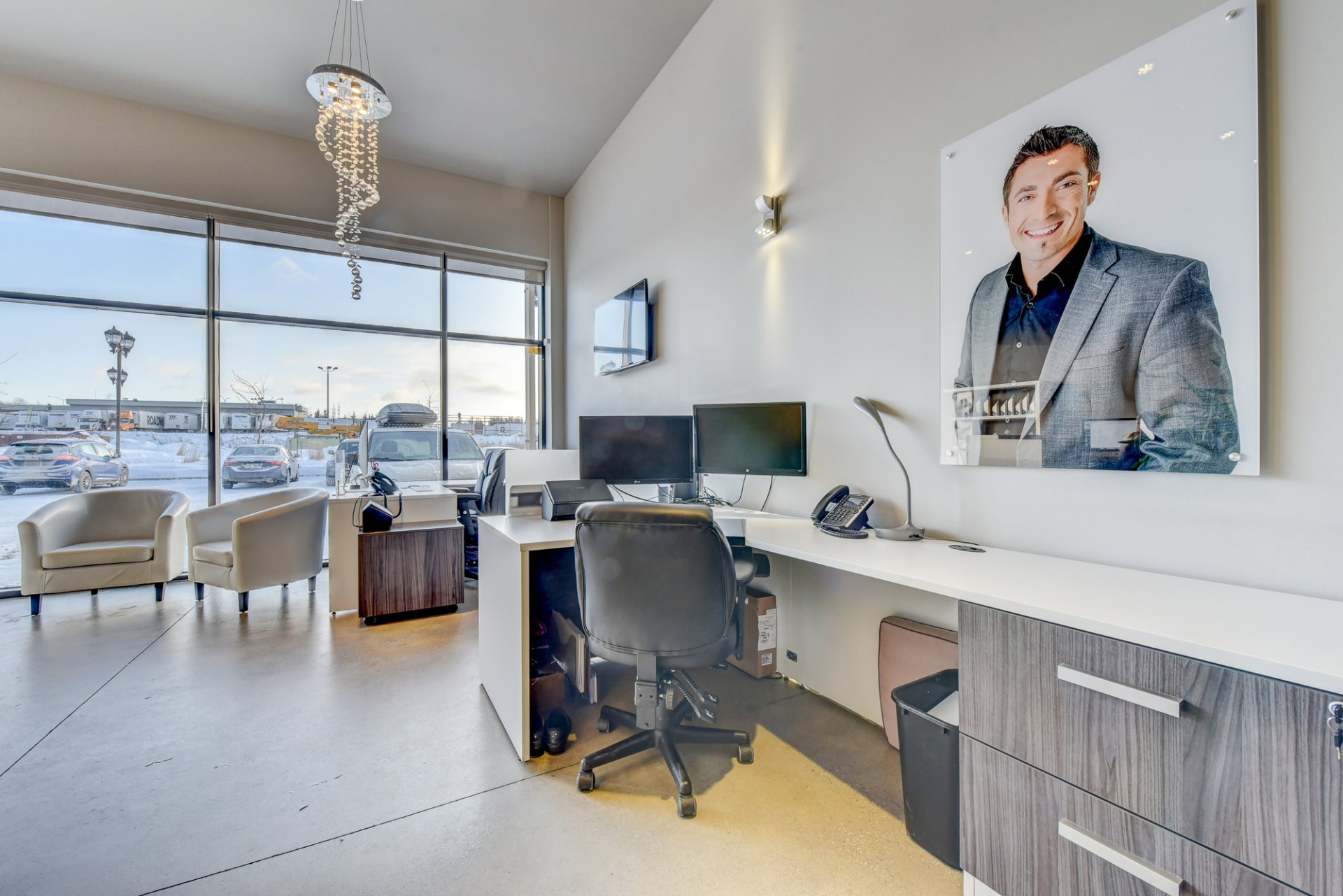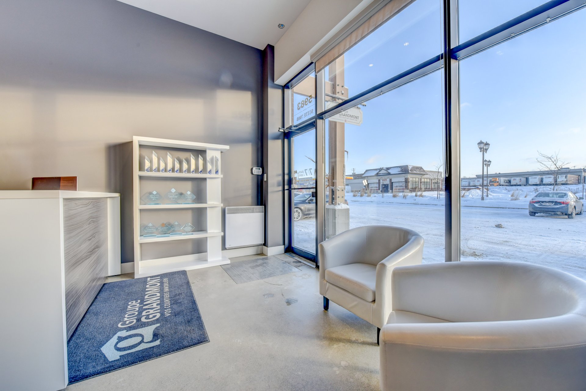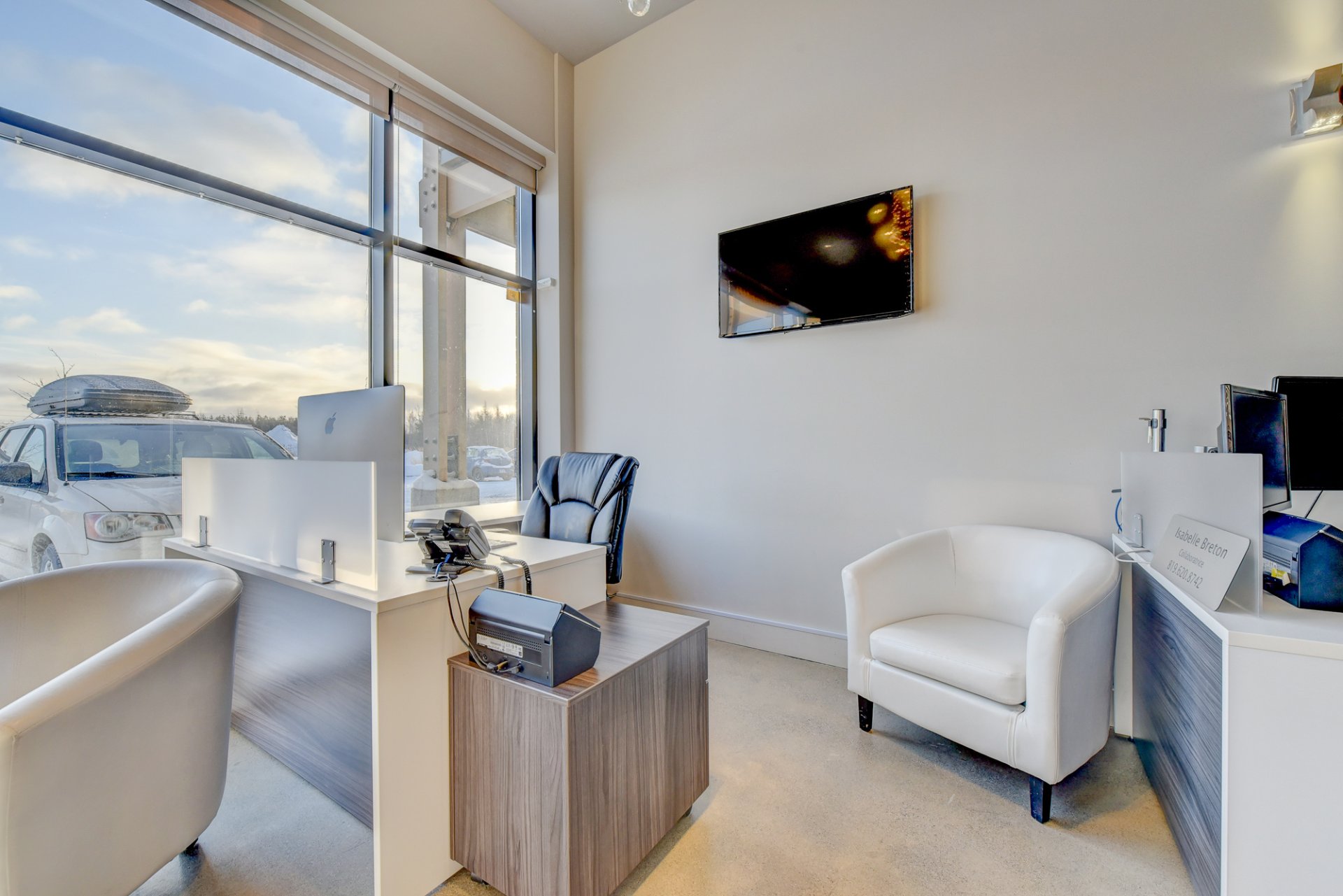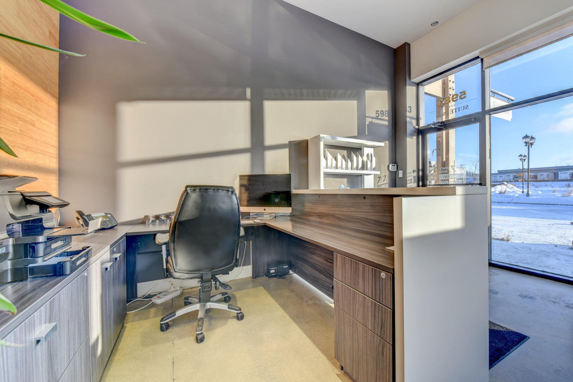 - Possibilité d’avoir 3 bureaux à aire ouverte ou une grande salle d’attente. Cet espace possède un pan de mur complet de fenêtres jusqu’au plafond