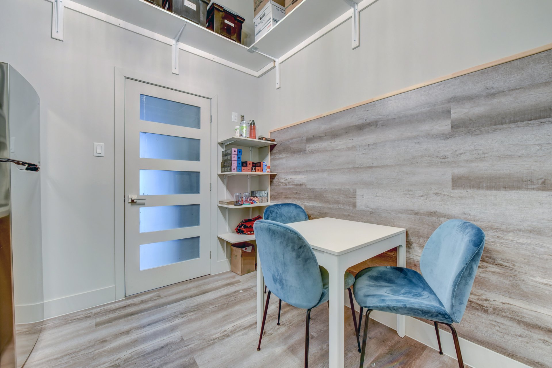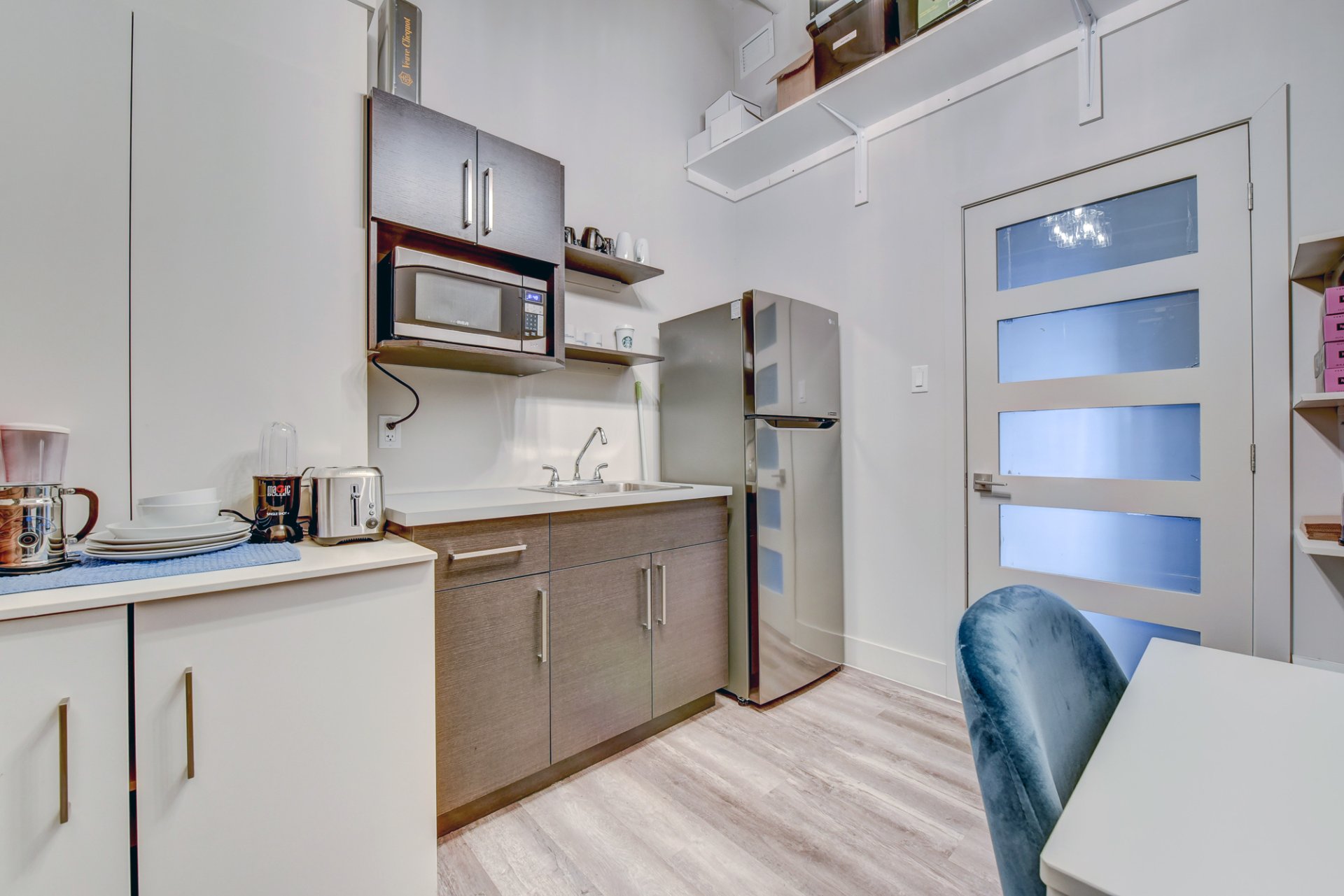 - Une dînette avec lavabo, espace pour réfrigérateur, quelques armoires pour la vaisselle, des tablettes en hauteur et une porte extérieure donnant à l’arrière du bâtiment.